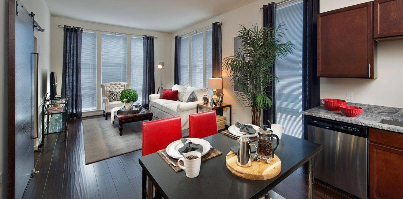 Столовая зона. Ее целесообразно организовать, если гостиная совмещена с кухней. В малогабаритных квартирах хрущевской постройки на место для приготовления пищи отводится всего 7 квадратных метров. Разместить на них обеденный стол со стульями или компактный мягкий уголок просто невозможно, поэтому место для приема пищи приходится организовать в гостиной, выделив для него часть свободного пространства и отделив от общей комнаты барной стойкой