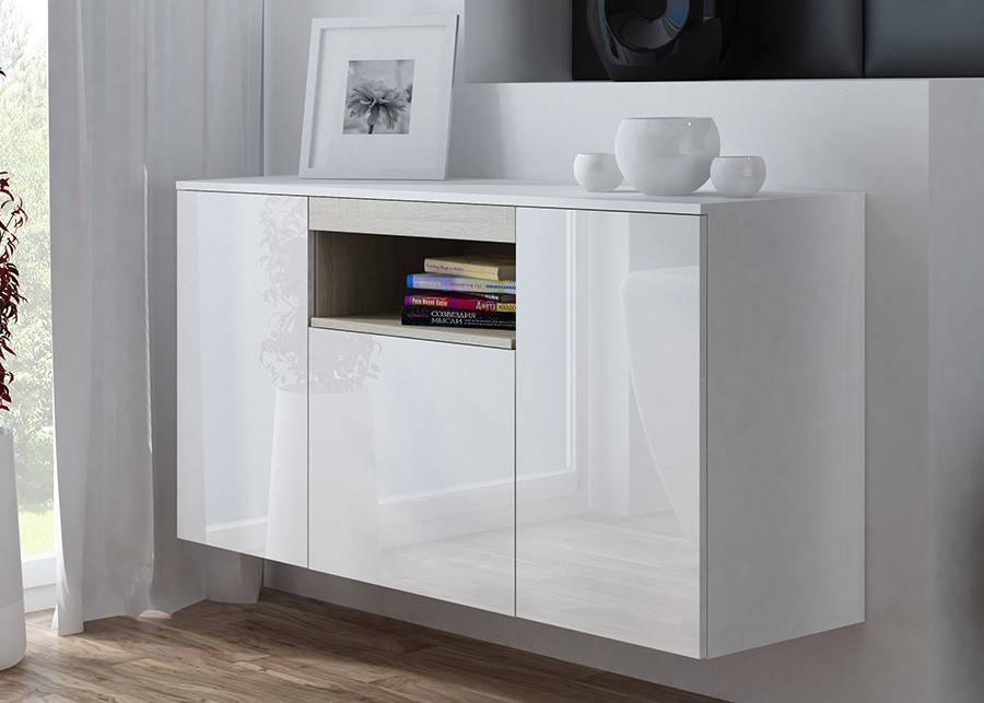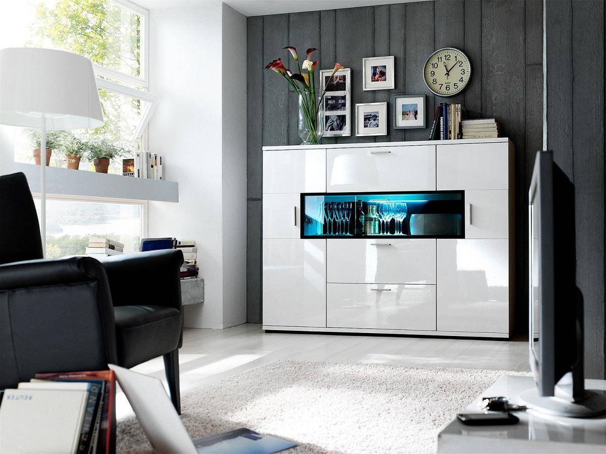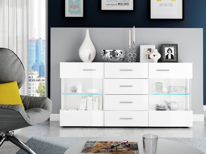 Белый цвет – это классика. Он хоть и нейтральный с точки зрения психологов, но находит свое отражение во многих современных направлениях: хай-тек, техно, минимализм, модерн и другие. Его спокойный цвет вписывается во все перечисленные интерьеры. Черная глянцевая гостиная с белым комодом – это стильно и роскошно!