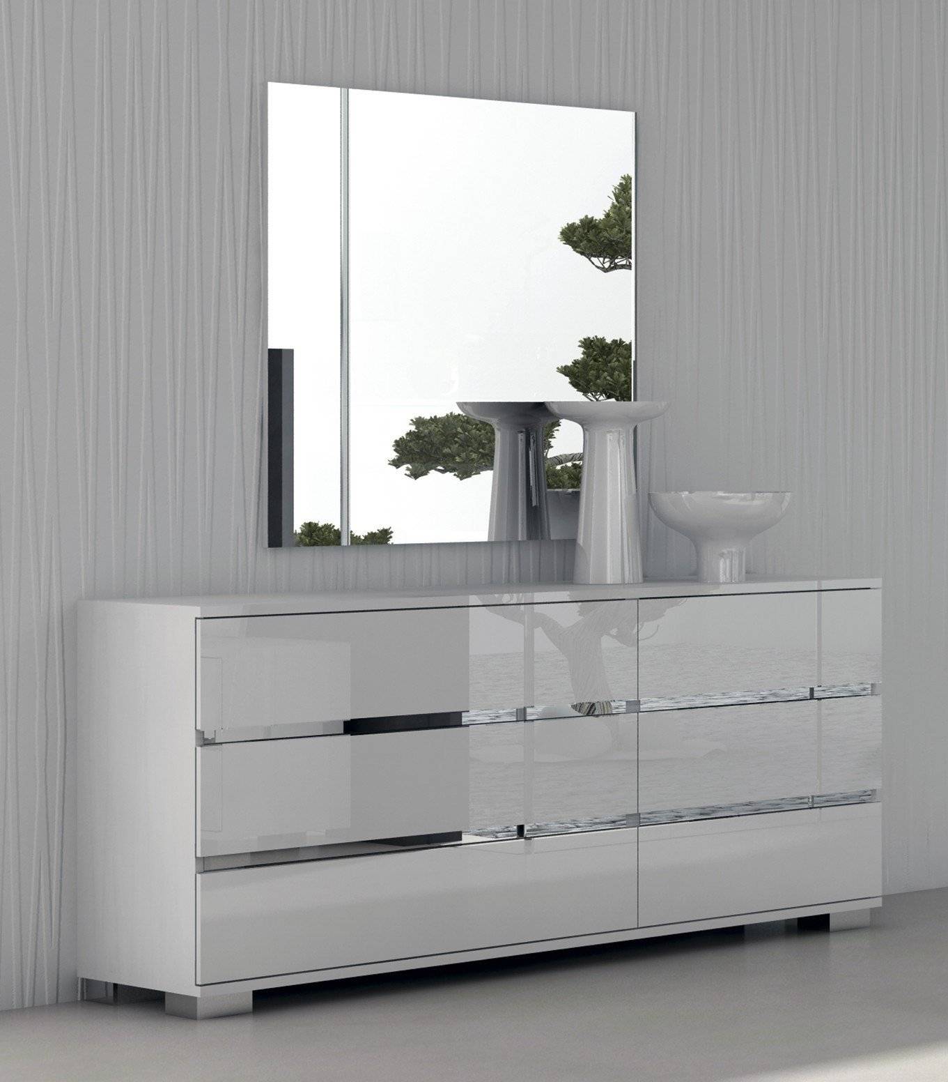 Здесь дизайнеры придерживаются черно-белой гаммы, монотонных, но лаконичных цветов и украшают комод элементами из стекла или камня. Поверхность чаще глянцевая.