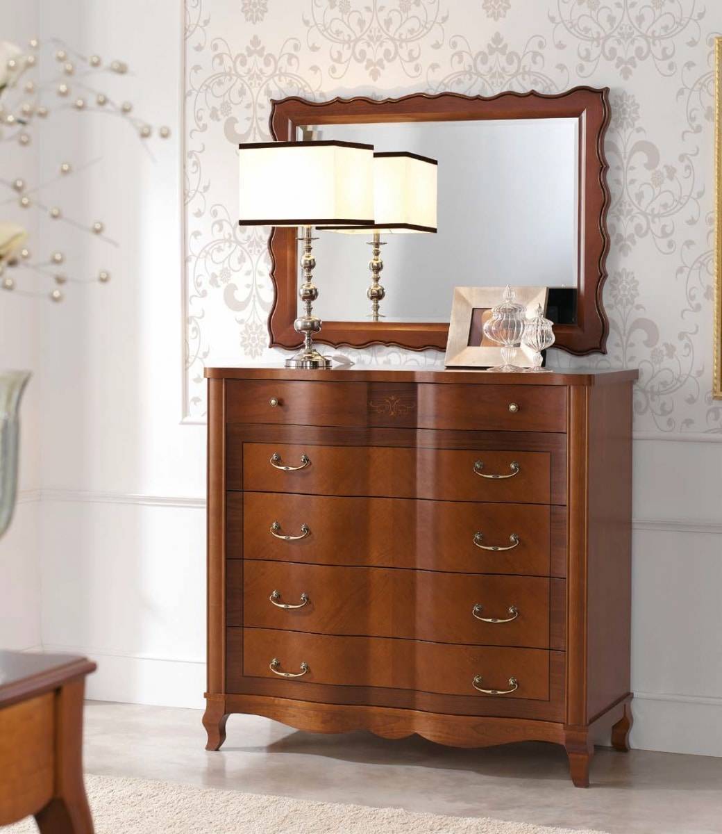Этот стиль будет уместен в помещении любого размера. Распространенной моделью в спальне с таким дизайном считается комод с зеркалом. Здесь он исполняет роль столика и предмета хранения.