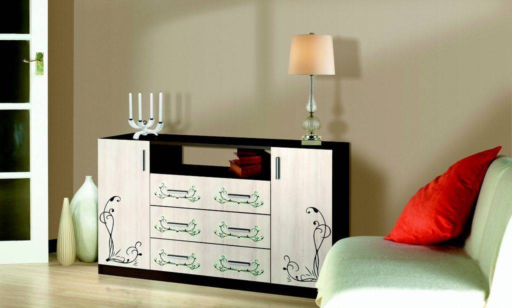 Не редко мебель, изготовленная из ДСП, дополнительно покрывается шпоном. Шпонированные изделия идеально имитируют поверхность натурального дерева. Комод не боится влаги и не расслаивается при использовании. Небольшой вес конструкции позволяет в любой момент сделать перестановку в гостиной.