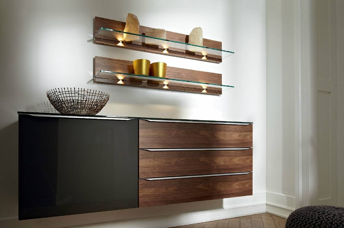 - Настенные. Модели напоминают навесные шкафы, так как не имеют опоры и крепятся на стену. Они не загромождают помещение, пол внизу доступен для уборки. Обычно настенные комоды используются для узких комнат, чтобы сохранить ощущение пространства. Небольшие размеры определяют назначение мебели: в них хранят документы, мелкие вещи или используют изделия, чтобы поставить телевизор.