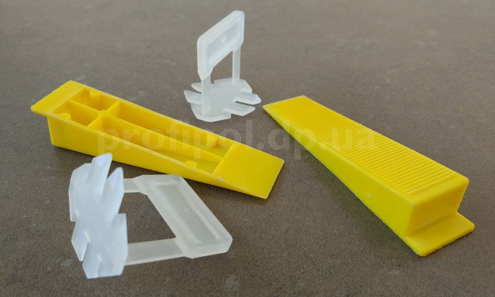 Самым простым комплектом, не требующим дополнительных приспособлений для монтажа, является СВП. Он в значительной мере упрощает процесс выравнивания смежных плиток в плоскости и позволяет обеспечить одинаковый, ровный зазор 0,8; 1; 1,5 и 2 миллиметра между всеми элементами покрытия. Достигается это за счет того, что зажимы выпускаются разной толщины. Они имеют форму Т-образной или П-образной стойки, закрепленной на основании, и предназначены для прижимания клиньев.