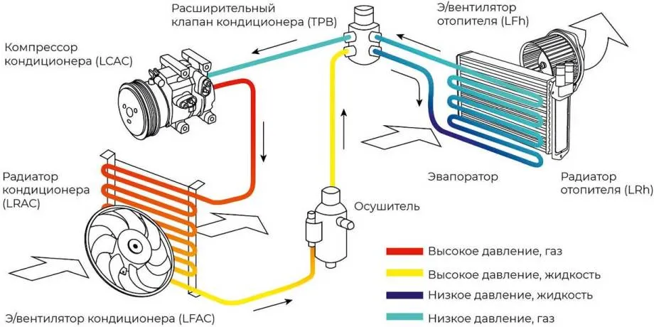 - При помощи вентилятора в конденсаторе температура теплоносителя понижается, и он переходит из газообразного состояния в жидкое, отдавая накопленное тепло. В это время давление повышается, как и температура. Нагретый хладагент поступает на терморегулирующий вентиль, где и происходит его охлаждение.