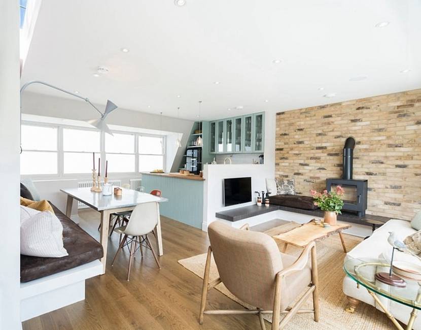 Нередко кухня, столовая и гостиная могут быть объединены в одно помещения с функциональным разделением посредством интерьера. Тип студии, предполагающий визуальное расширение пространства за счёт минимума перегородок, может быть оптимальным вариантом для дизайна дома 7 на 8.