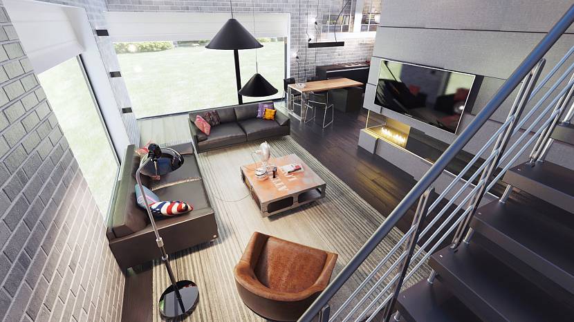 Обязательным элементом интерьера в двухэтажном доме является лестница. Она может размещаться рядом с прихожей. Или стать разделителем пространства между кухней и гостиной при планировке-студии.