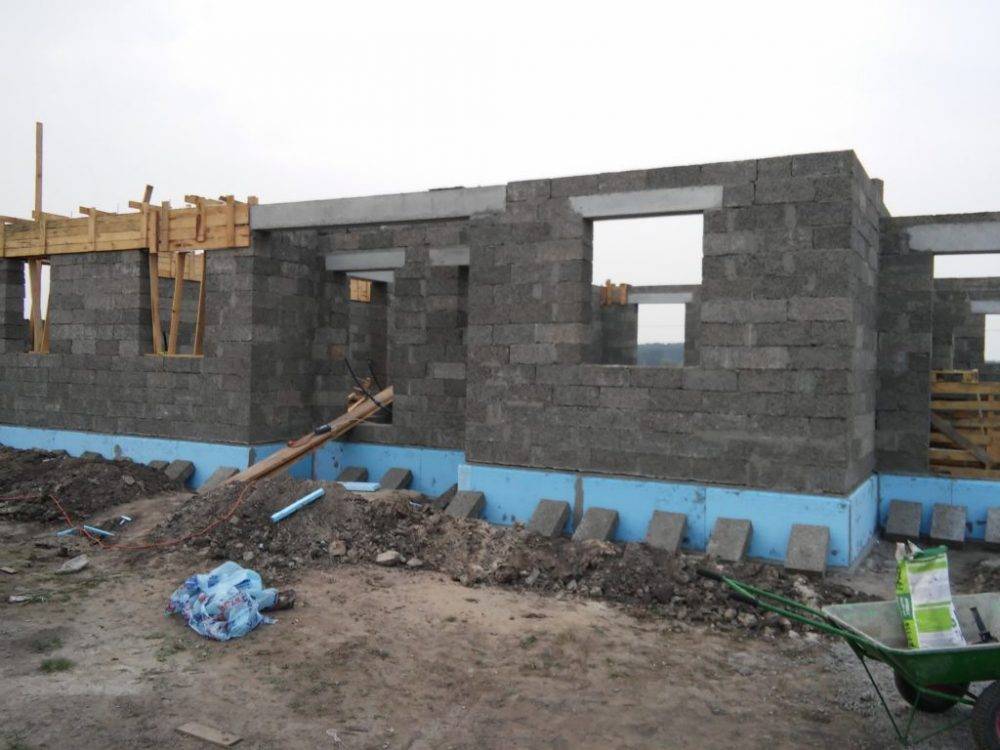 Эту часть строения выполняем с помощью кирпичной кладки высотой 40-50 см. Основная функция цоколя – защитить блоки из арболита от вредного воздействия воды.