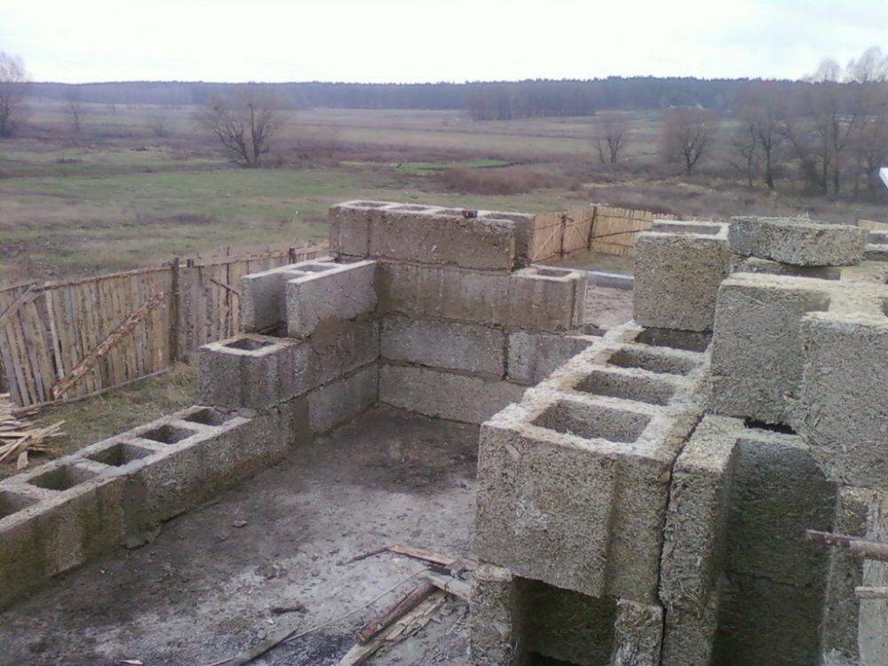 Технология строительства стен из арболитовых блоков аналогична процессу возведения стен из каких-то других блоков (газобетонных, пенобетонных, керамзитобетонных) и очень похожа на кладку из кирпича. Блоки выкладываем в шахматном порядке, рядами, начиная с угла. Степень вертикального отклонения проверяем с помощью уровня. Для скрепления блоков используем цементно-песчаную смесь. После установки трех рядов делаем перерыв на 24 часа, чтобы скрепляющий раствор полностью высох.