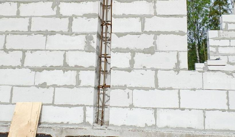 Толщина стены – 35–40 см, расстояние стержня арматуры от края блока – 6 см. Если толщина кладки 20 см, то допускает армирование одним стержнем.