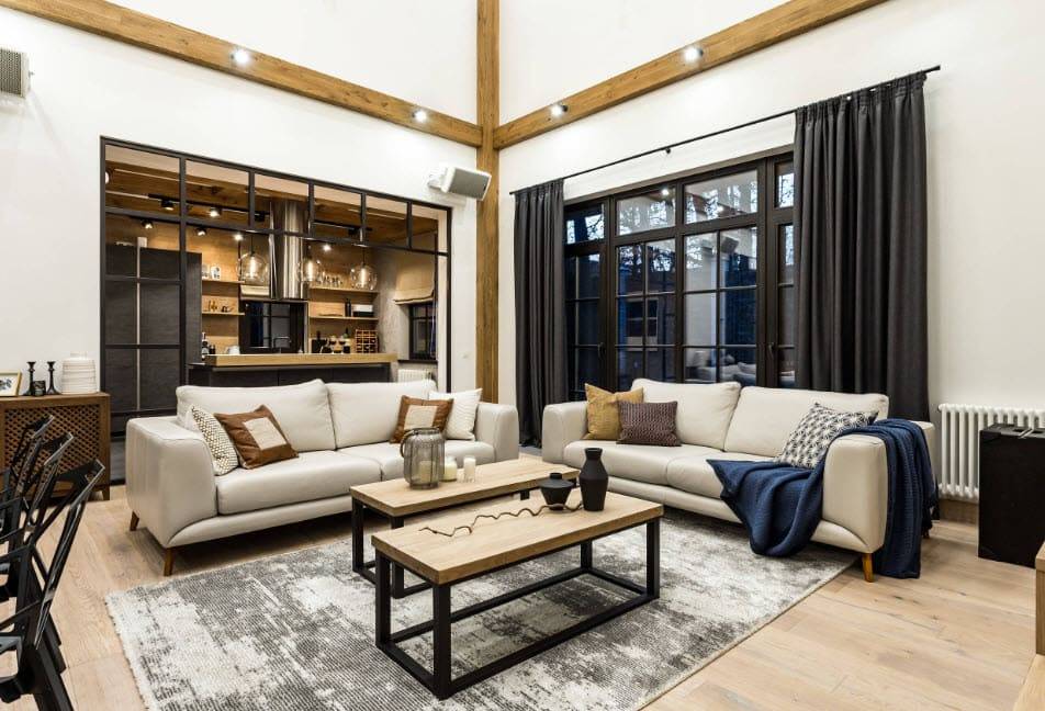 Из мебели в большой гостиной может разместиться грубоватый, массивный диван, журнальный стол, кресло-качалка, комод, покрытый патиной шкаф, открытые полки.