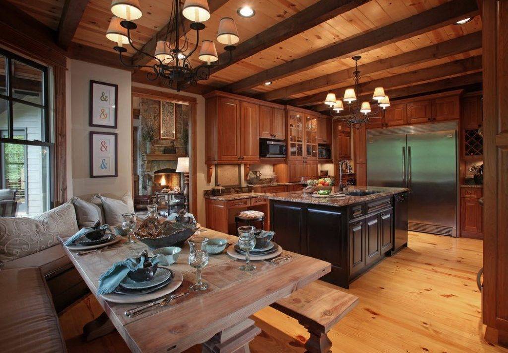 Раз так, старайтесь рабочую столешницу с мойкой все-таки делать каменной. Древесным будет все остальное, включая не прилегающие к плите стены и потолок. Мебель обязательно будет массивной – слабые женщины на высокогорных пастбищах не жили, потому об их комфорте никто не заботился.
