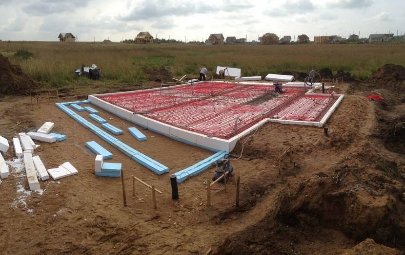 Такая технология представляет собой сооружение корыта на основе пенопласта, который имеет отличные прочностные показатели. Конструкция является цельным сооружением с прикрепленной опалубкой, которая выполняет предназначение дренажной системы и располагается на утрамбованной подушке из песка и гравия. После чего осуществляется монтаж каркасной сетки на основе арматурных прутьев, это позволит осуществить укладку коммуникаций для будущей постройки. Затем арматура заливается бетоном и производится шлифовка поверхности с использованием различного инструментария.
