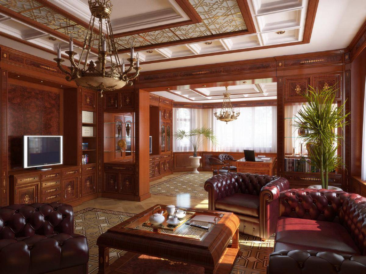 - натуральные и добротные отделочные материалы, используемые при оформлении гостиной, в особенности дерево благородных пород — красное, морёный дуб, орех, — использующиеся в обшивке стен, изготовлении солидной, нередко антикварной, мебели, карнизов и дверей;