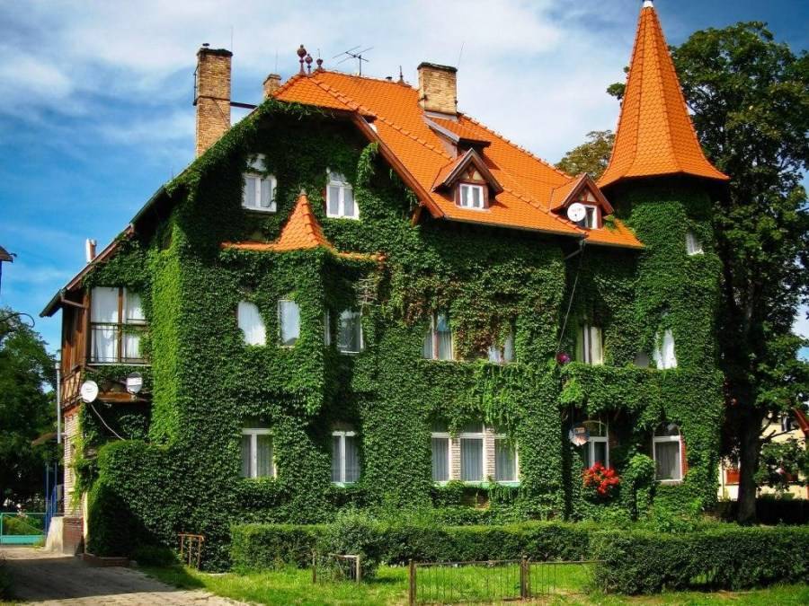 Особо шикарно выглядят вьющиеся по навесу ветви плюща. А вот входная дверь располагается по центру лицевого фасада. Выбираются массивные модели, изготовленные в темной палитре красок.