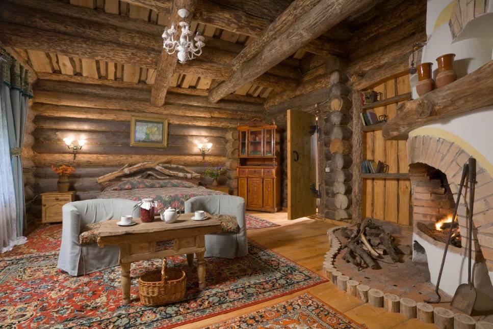 Здесь вполне уместны подсвечники, массивная деревянная мебель, абажуры, множество вышитых картин, салфеток, скатертей. Такой интерьер вдохновляет своим спокойствием и умиротворенностью. Здесь центральным элементом интерьера уже является не русская печь, а аристократический камин, выполненный в классическом стиле.