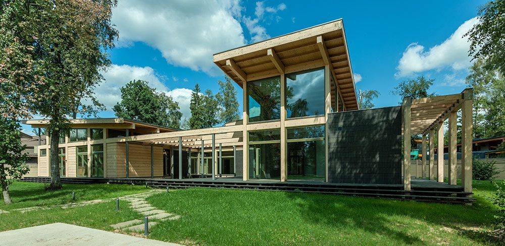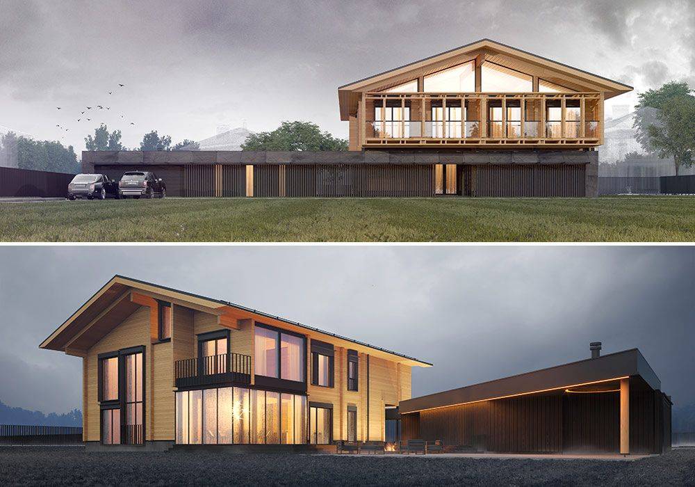 Архитектурная концепция комплекса построена на диалоге двух объемов, контрастных по форме, материалу и содержанию. Каменный — 150 м², тяжелый и тектоничный, совмещает в себе функции гаража, блока персонала и котельной. Деревянный — 500 м², легкий и динамичный, из клееного бруса, с классическим набором функций загородного дома. Сохранив рациональный подход к проектированию, авторы добавили в композицию элементы роскоши: массивную кровлю с двойной стропильной системой, фальц ручной работы со скрытыми водосточными желобами и другие нестандартные технические решения.