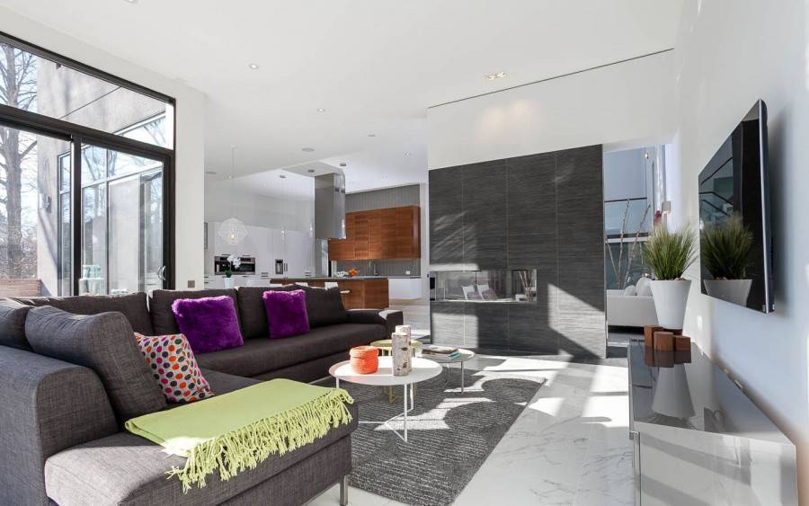 Примечательно, что этот стиль не подразумевает использование мелочей, которые приняты для других направлений. Все аксессуары сведены к минимуму. Основными украшениями могут быть только лестницы и лифт, если он есть.