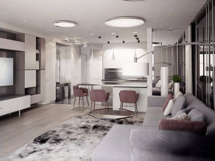 Стоит отдавать предпочтение светильникам, изготовленным из стекла, пластика, хромированного металла. Основной источник света размещается на потолке, а в специальные ниши на стене или в полу монтируют точечное освещение. Чтобы рассеять четко направленный луч, используют зеркальные поверхности, которые также помогают увеличить площадь квартиры за счет отражения.