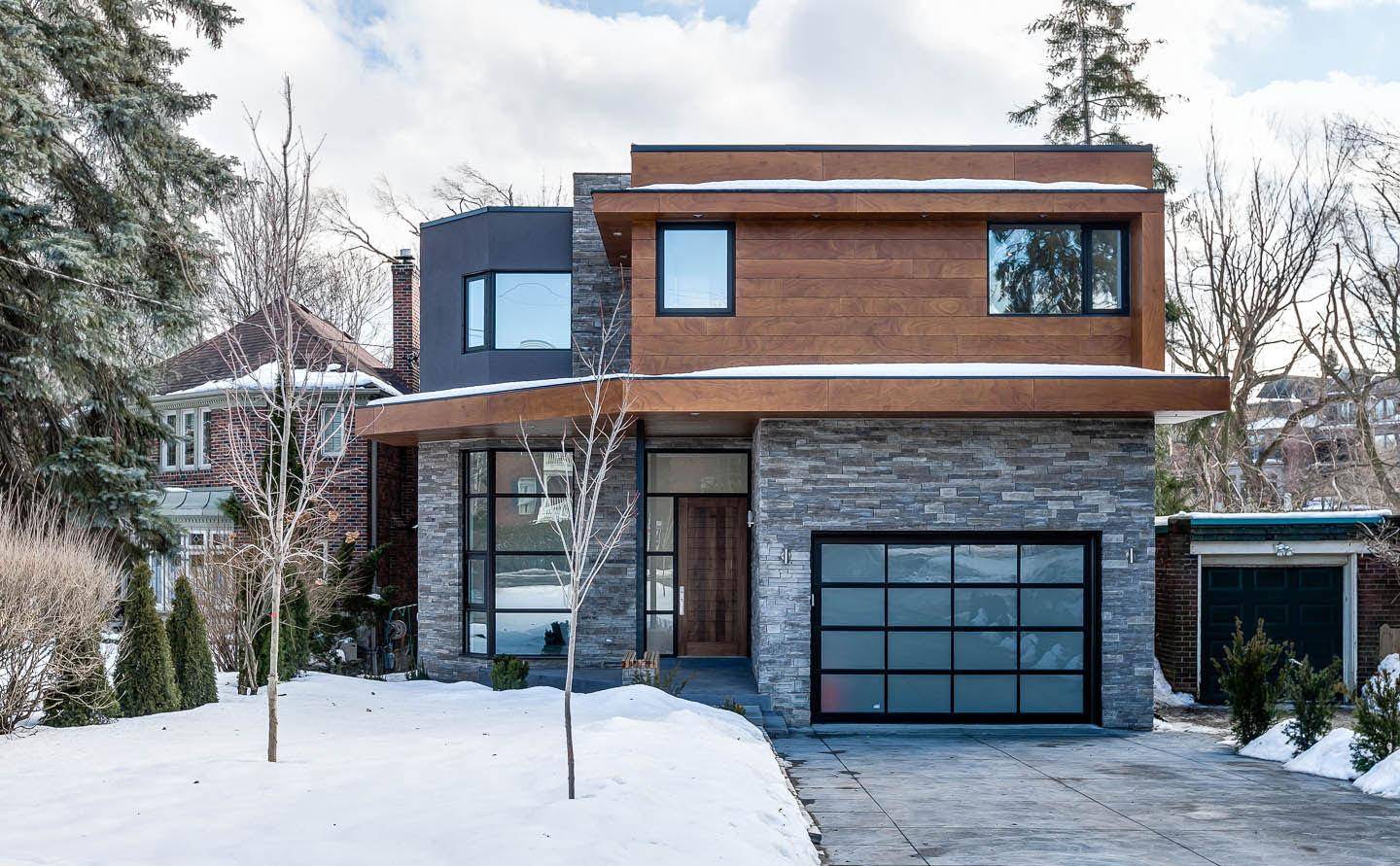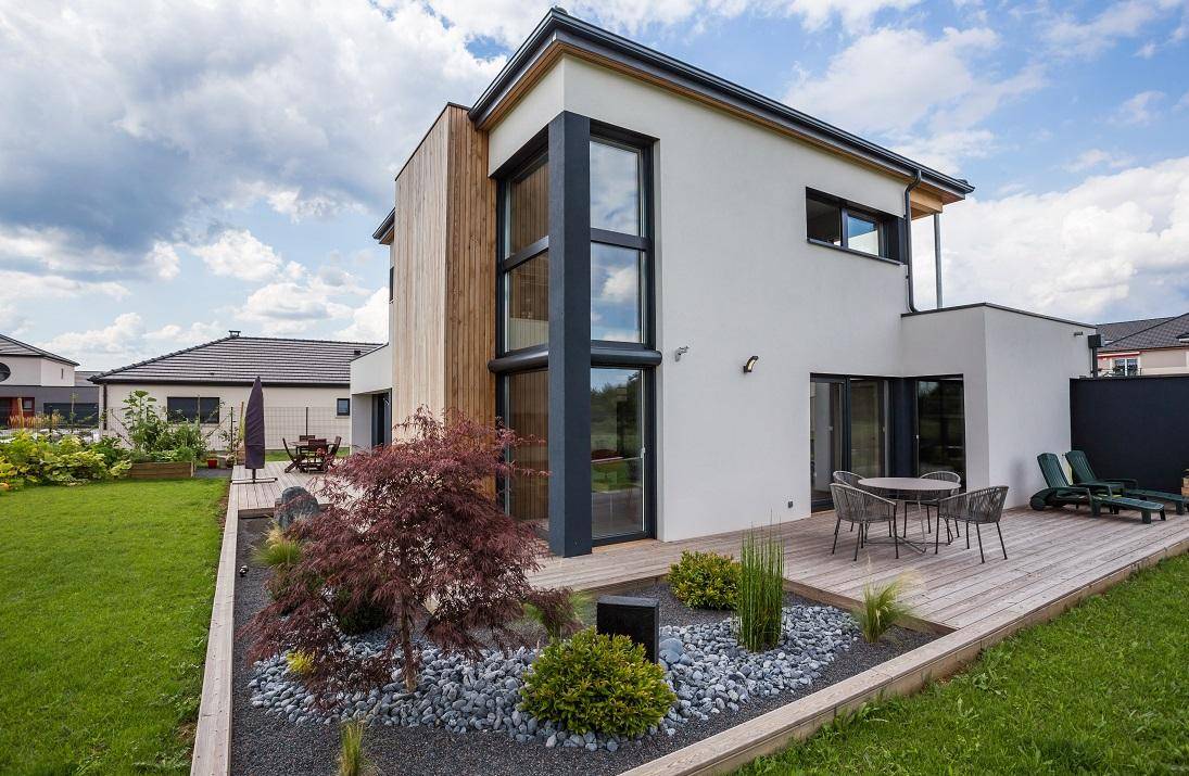Фасады домов отличает использование большого количества стекла во внешней отделке, что увеличивает пространство. Интенсивное освещение заменяет декор. Кроме освещения, изящность фасаду придают и глянцевые, блестящие материалы в его отделке. Материалы фасадов – это, как правило, искусственные материалы: пластик, металл, стекло или бетон. Часто встречаются блокированные дома-коттеджи. Фасад часто выполнен из крупных бетонных блоков. Или же это могут быть каркасные и модульные дома, выстроенные из современных СИП-панелей. Они наполнены внутри деревянной стружкой или пенопластом, что позволяет сохранять тепло в доме в холодное время года.