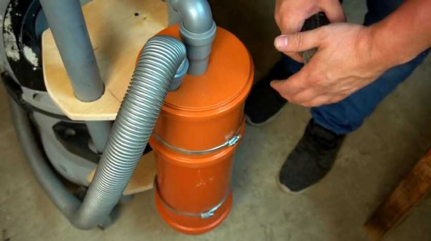 Как вариант, можно сделать съемный циклон своими руками с домашним пылесосом, если использовать кусок пластиковой трубы 40Х100 мм, а патрубок вставлять в крышку, которой больший диаметр будет плотно закрываться.