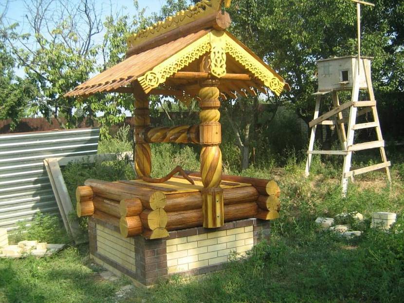 Выступающий элемент на срубе или бетонном основании носит название оголовок. Он может быть открытым или иметь специальное верхнее сооружение в виде домика. Второй вариант используется намного чаще в декоративных целях.