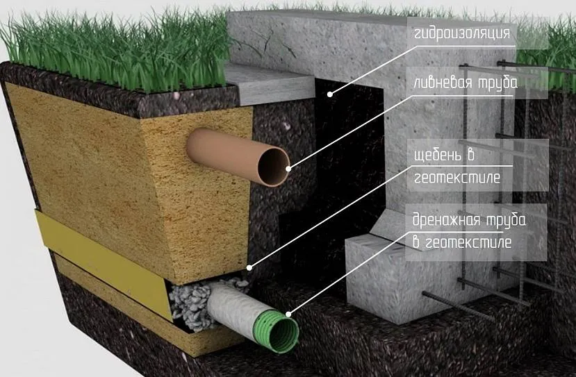 Во время сооружения водостока важно учитывать все элементы, например, ливневку, основные части дренажа, дополнительную гидроизоляцию. Только так получится сделать качественную защиту фундамента от подмывания