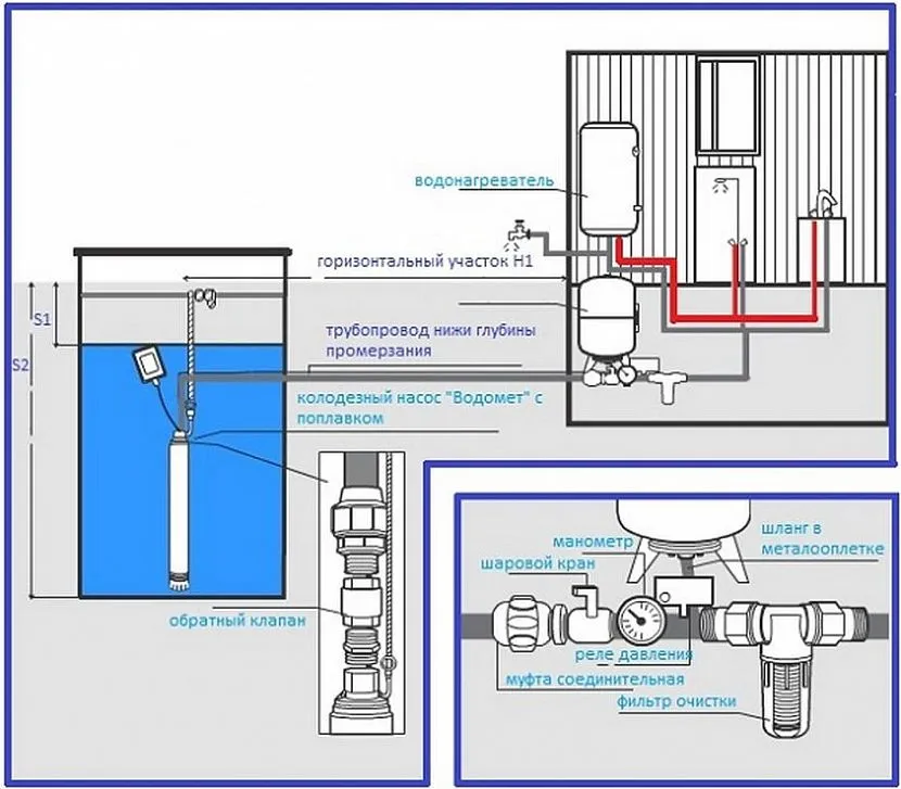 Стационарный наружный вариант предусматривает и прокладку от него напорной трубы до коттеджа ниже уровня промерзания грунта. При устройстве круглогодично эксплуатируемого трубопровода прокладка его ниже глубины сезонного промерзания обязательна.