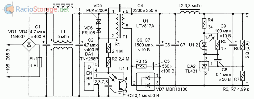 За основу ИИП взята типовая схема разработчика микросхем для ряда TinySwitch-ll (рис. 1), особенностей она не имеет. Чертёж возможного варианта печатной платы устройства показан на рис. 2. Она изготовлена из фольгированного с одной стороны стеклотекстолита и рассчитана на установку как диодов 1N4007, так и диодного моста DB107.