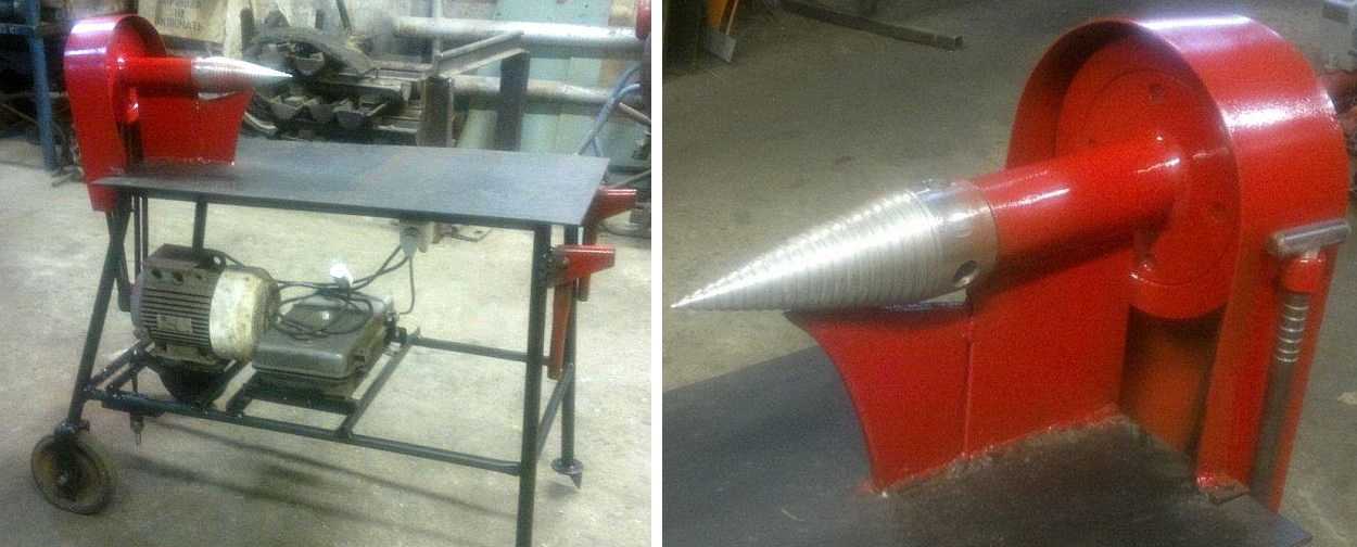 Конус дровокола вращается с помощью электродвигателя. Он входит в полено и, за счет постепенного увеличения диаметра, разрывает его по волокнам. Дрова на винт подаются вручную. Самодельный винтовой дровокол обладает следующими преимуществами: