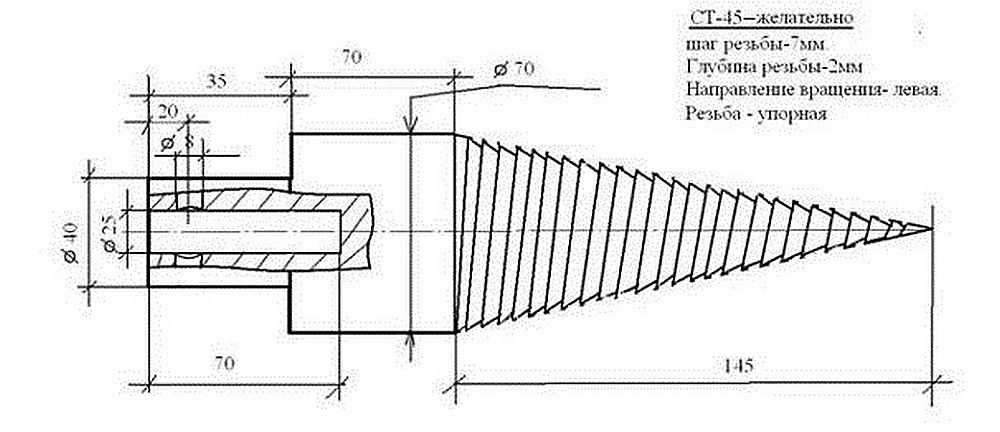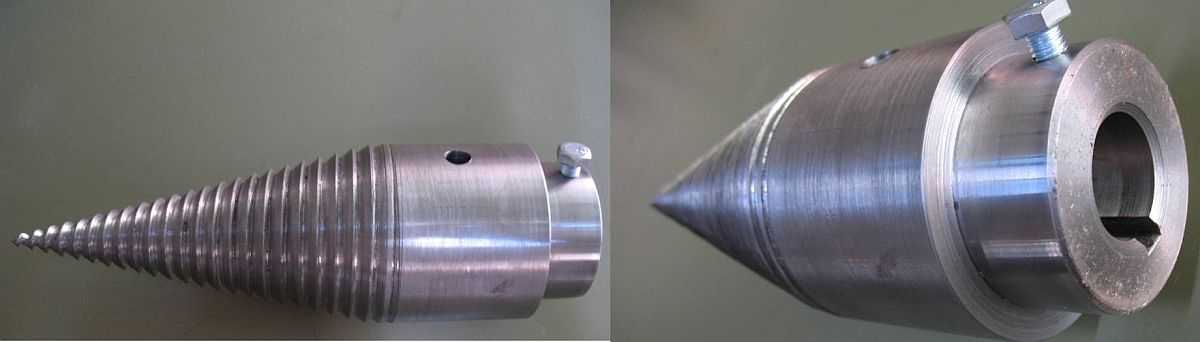Режущую часть можно купить или самому выточить, если у вас есть навыки токаря. Помните, что наличие резьбы облегчит вам работу с дровоколом, поэтому желательно её нарезать (рекомендуем левую нарезку). Глубина резьбы 2−3 мм, шаг 6−7 мм. Нос у конуса должен быть острозаточенным. Место посадки на редуктор должен иметь глубину не менее 70 мм.