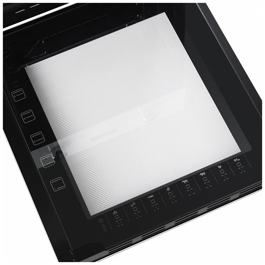 Модель представлена в универсальном дизайне и легко вписывается в любую кухню. При изготовлении использованы нержавеющая сталь и тройное закаленное стекло, поэтому во время готовки дверца никогда не нагреется до опасной температуры. На внутренние стенки по инновационным технологиям нанесена эмаль SMART CLEAN, которая отталкивает жир и грязь – за духовкой легко ухаживать, нужно только соблюдать рекомендации для активации гидролизной самоочистки.