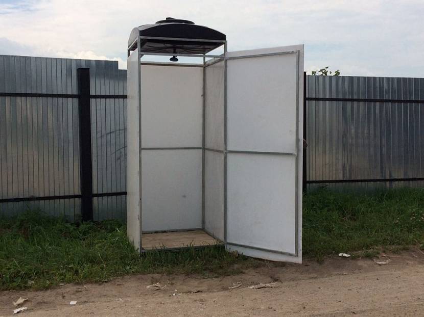 Необходимо место установки выбрать так, чтобы легкая постройка была рядом с коммуникационными сетями: канализация и водопровод. Нередко под душ выкапывают выгребную яму, так проще и дешевле