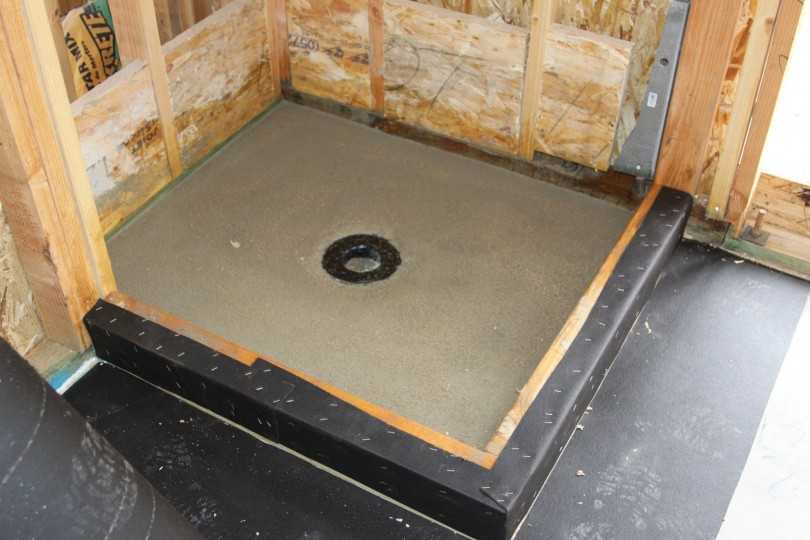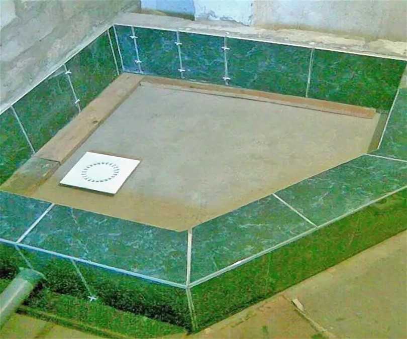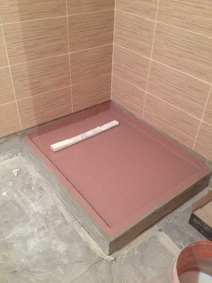 - Поддон заливается водостойкой стяжкой. Слой заливки, примерно до пяти миллиметров.