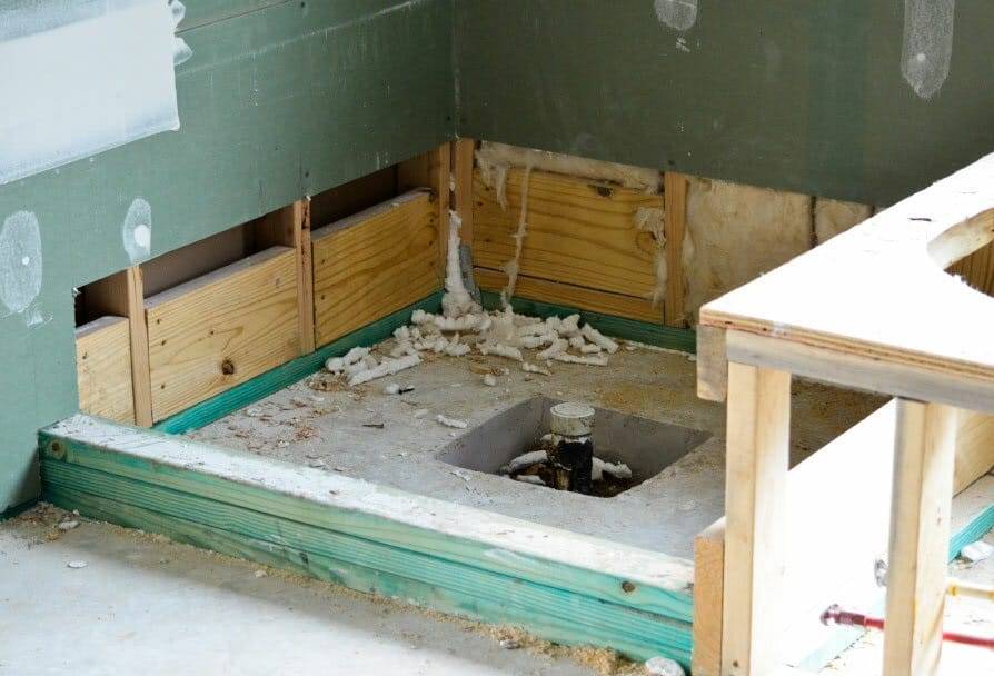 Сначала требуется подготовить помещение. Для этого нужно установить трубы для водоснабжения и стока. Деревянные элементы следует обработать антисептиком.