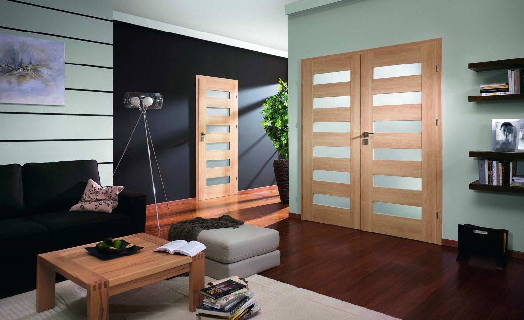 Если цвет меблировки смежных комнат отличается, то отличным решением проблемы будет монтаж шпонированных межкомнатных моделей. Стороны дверей, выходящие в коридор или холл, оформляют одним цветом. А для других сторон подбирают индивидуальное цветовое оформление. Стеклянные вставки при этом сыграют роль объединяющего элемента.