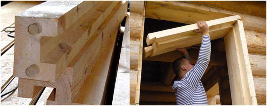 Сделав предварительно выборку 1,5х55 см в брусьях для короба, монтируем из них обвязку – «примеряем» вхождение в дверной проем