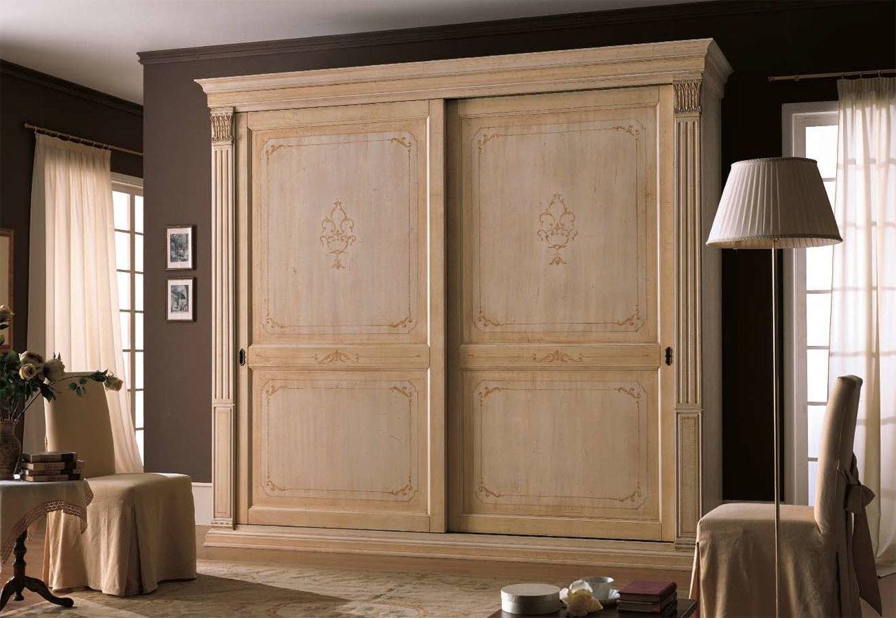 Распашные или раздвижные конструкции в светлых тонах с естественными фактурами, добавят гардеробной неповторимого французского шарма и винтажности. С помощью легкого и тонкого оформления с украшением в виде завитушек, резьбы или орнамента получается сделать обстановку более изящной.