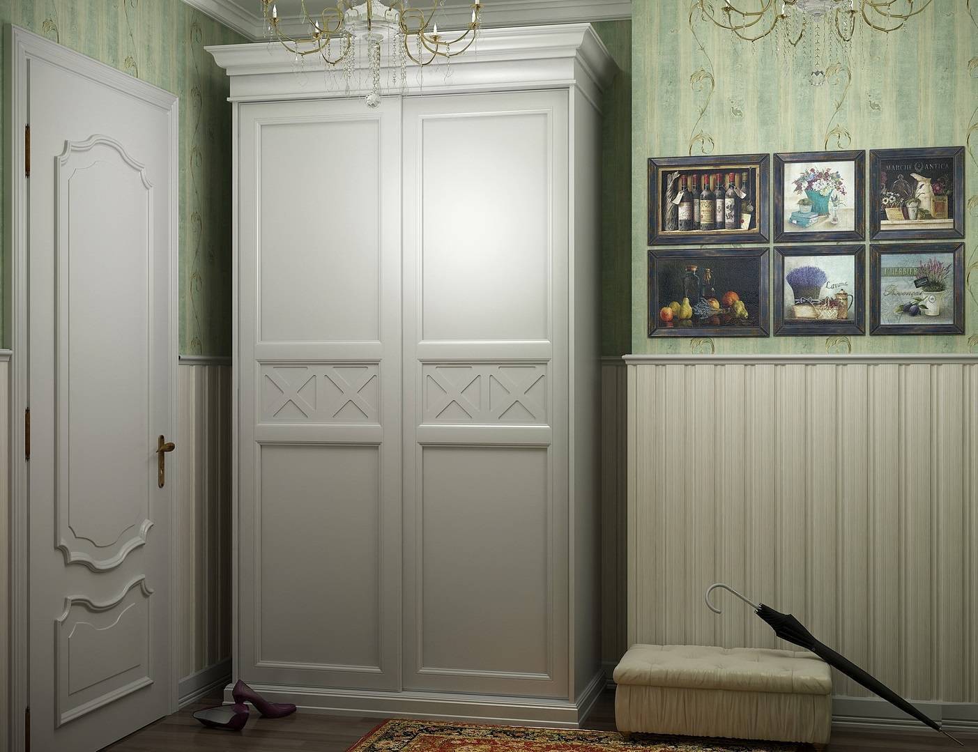 В отделки двери-купе в стиле прованс могут присутствовать различные декоративные элементы, например флероны, которые помогают сделать дверь более легкой и изящной.