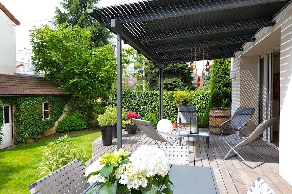 Многие выбирают среди разнообразия материалов металл. Такая зона отдыха может быть оформлена в стиле минимализма, сочетать в себе оригинальность и практичность.