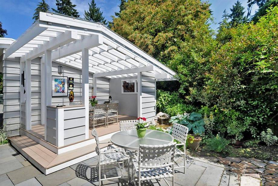 - Беседка с летней кухней. Этот вариант предпочтителен для тех, кто любит пообедать на свежем воздухе.