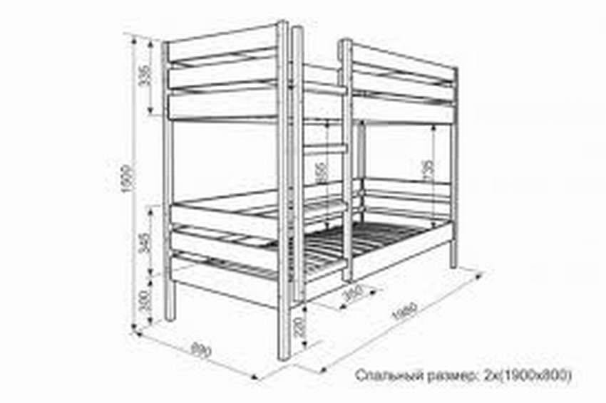 При изготовлении кровати нужно иметь в виду, что на нижней постели может сидеть не только ребёнок, поэтому расстояние до нижней части верхней кровати не должно быть менее 85 см. Габарит спальных мест в случае покупных матрасов определяется их шириной и длиной. Если вы сами сделаете матрасы из двух слоёв поролона в чехле из плотной ткани, то размеры принимаются, исходя из личных предпочтений.
