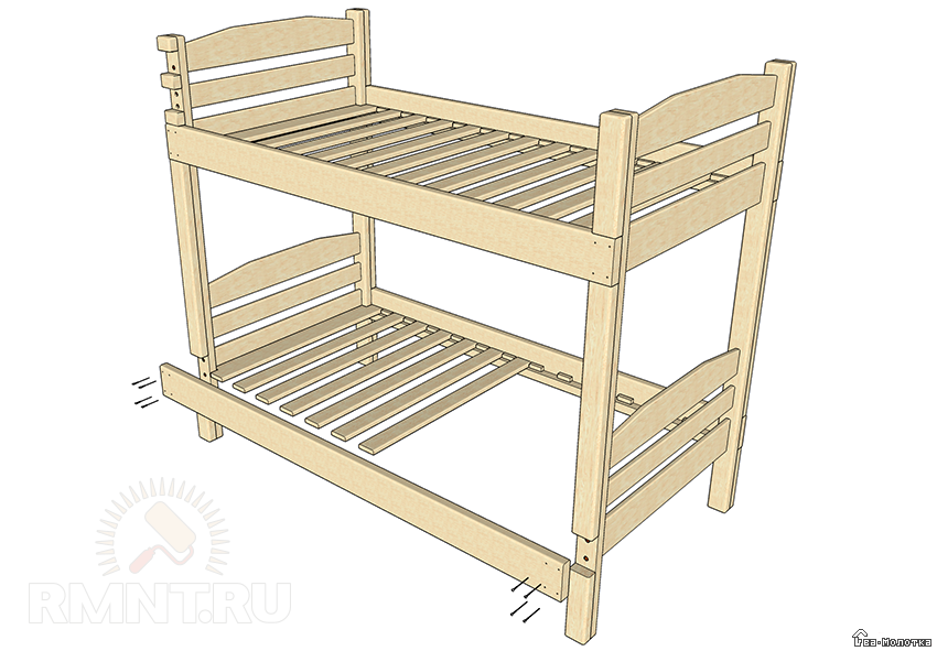 Изножье и изголовье соединяются в нижней части с досками несущей рамы с помощью шурупов. После этого укладываются поперечные рейки, держатели матраса, причем крайние из них подпиливаются в уголках для плотной установки. Их закреплять не нужно. Таким же образом выполняется и сборка второго яруса.
