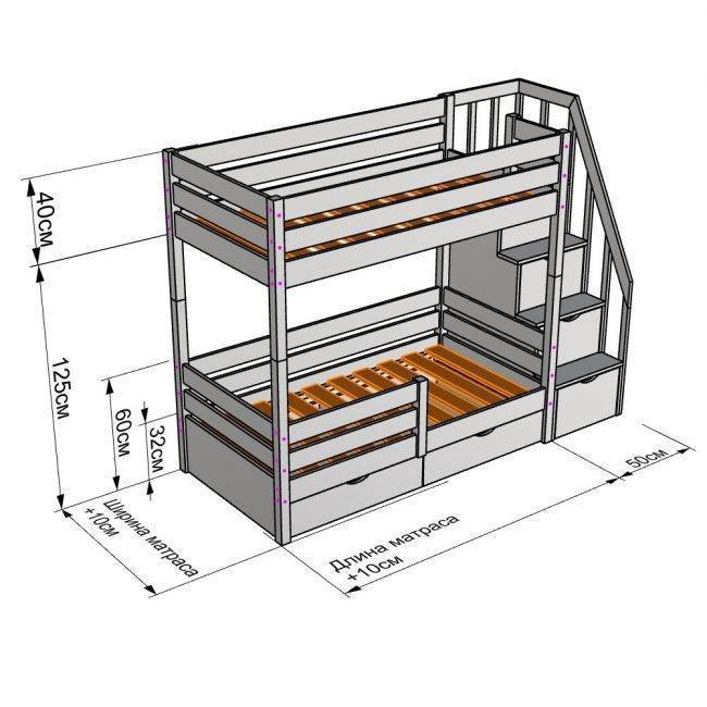 Покупайте матрасы заранее и подгоняйте габариты кровати под них. Оптимальная ширина лестницы – 40 см, высота ступенек – 25 см, бортики – не менее 30 см, в зависимости от высоты матраса и возраста спящего.