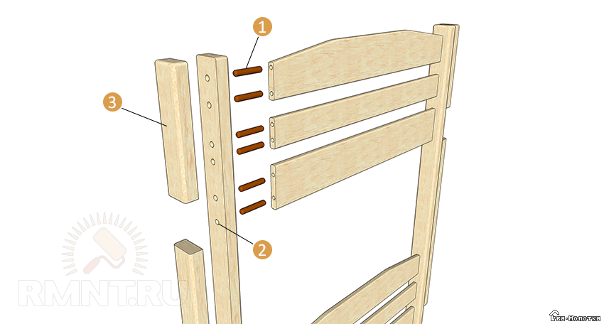 Порядок монтажа: 1 — шкант 8 мм; 2 — стойка и планки спинки сверлятся одновременно; 3 — это часть крепится после сборки всех остальных частей изголовья