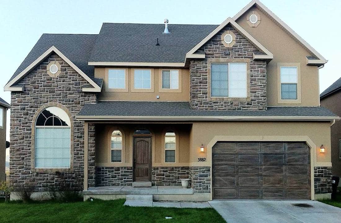 Фасад из натурального камня смотрится роскошно и очень выигрышно на фоне других отделочных материалов