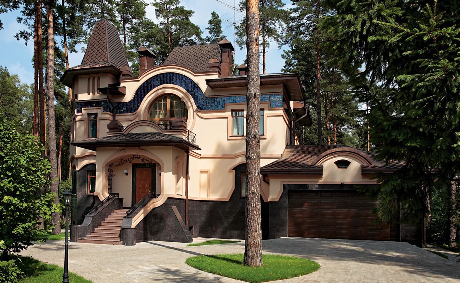 Дом в стиле модерн – характеризуются плавными линиями, напоминающими перетекающую волну. Если вы решили построить загородный коттедж в этом стиле, следует очень гармонично вписать его в свой участок, и хорошо продумать о том, какой будет ваш сад.