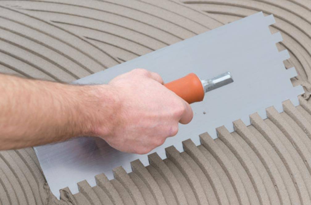 Смесь наносится зубчатым шпателем так, чтобы образовались небольшие гребни. Они увеличивают сцепление с плиткой, которая тыльной стороной укладывается на клей и хорошенько прижимается.