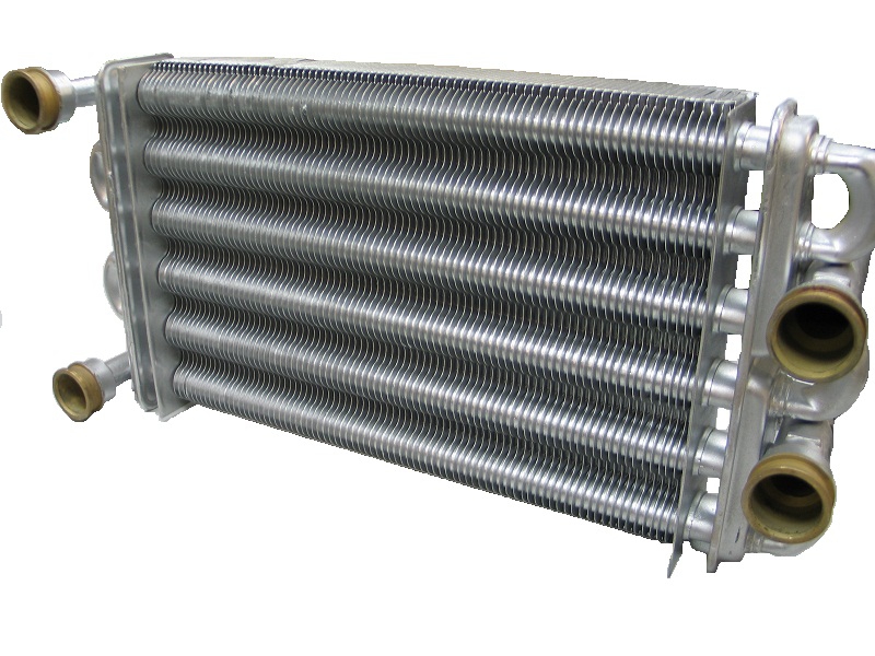 Сдвоенный теплообменник имеет два модуля, которые считаются единой деталью. Первичный модуль отвечает за нагрев теплоносителя для отопления, пластинчатый подогревает воду. Первичный элемент выглядит как изогнутая оребрённая трубка, пластинчатый — набор компактно устроенных пластин.