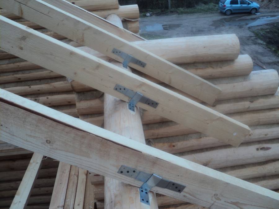 Если дом построен из бруса, то стропильные ноги опираются на верхние венцы, а крепление их осуществляется с помощью болта, скобы или нагеля. Соединение стропил производится соединением с помощью металлических накладок и болтов. В иных случаях рекомендуется использовать мауэрлат, о котором будет рассказано ниже.