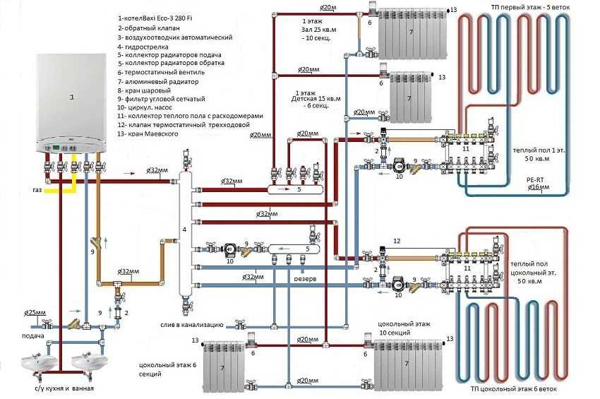 Схема монтажа отопления с тёплым полом в частном доме